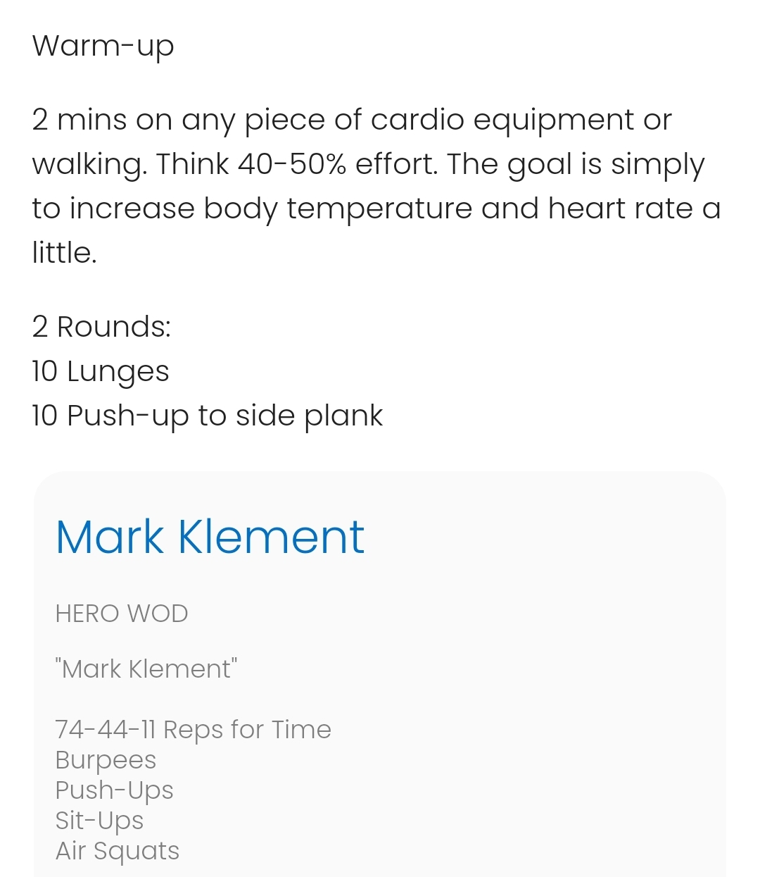 It's a good one today folks! See screenshot below. Basically, 74 burpees 74 Push ups 74 sit ups 74 squats Then 44 of each, then 11 of each. Hero WODs are set in memory of someone who died in the line of duty, and are set as the daily workout every few weeks.